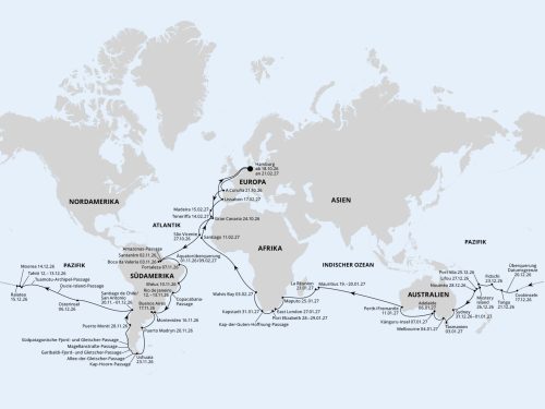 - 6 Overnights (Rio de Janeiro, San Antonio/Santiago de Chile, Port Louis/Mauritius, Port Elizabeth, Papeete/Tahiti, Sydney)